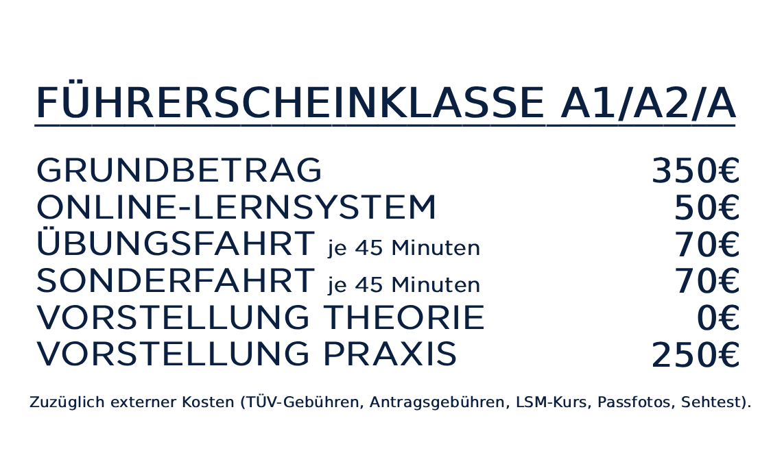 Mit der Klasse A1 darfst Du ab 16 Jahren Krafträder fahren mit einer Motorleistung von maximal 11kw und bis zu 125ccm Hubraum. Die Klasse A2 erlaubt es Dir ab 18 Jahren Krafträder mit einer Motorleistung von 35kw zu fahren. Ab 24 Jahren kannst Du die offene Klasse A erwerben.